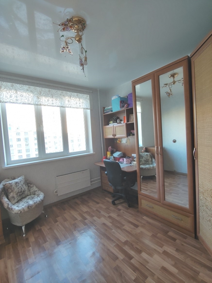 Комнаты изолированные: 11,4м2; 14,1м2; 18,1м2. Окна (ПВХ, двор): 3 окна – запад, 1 окно – восток. Состояние – хорошее. Встроенная мебель остается, остальное – по договоренности. Высота потолка – 2,68 м.